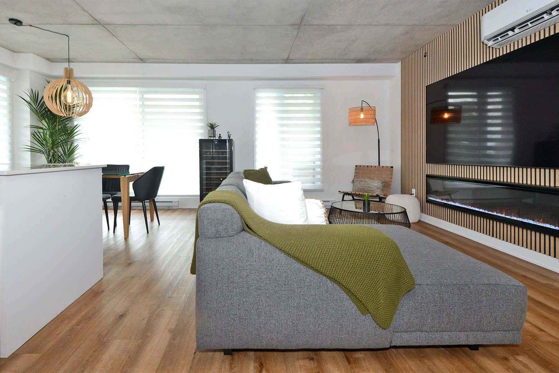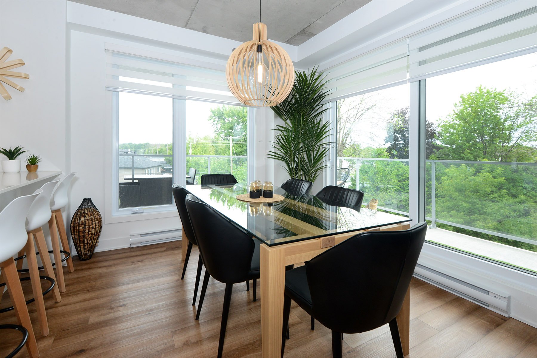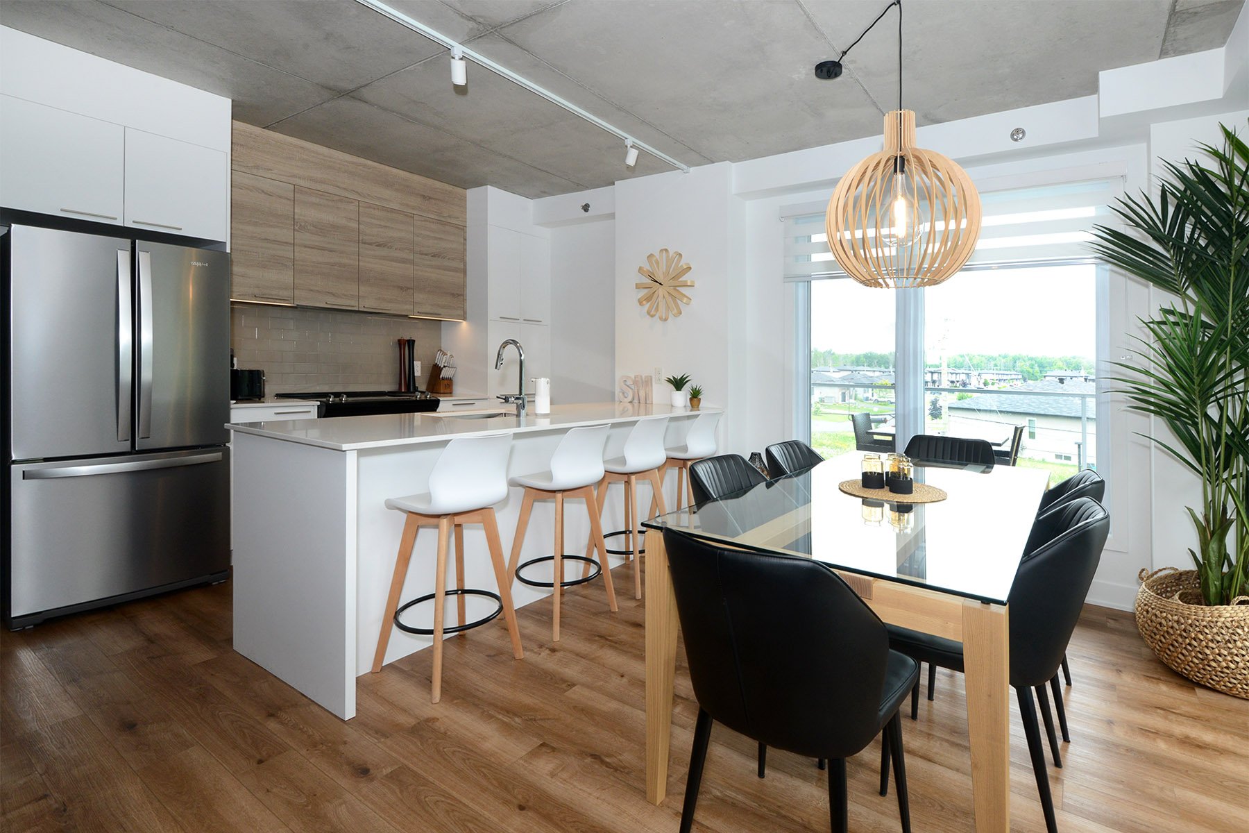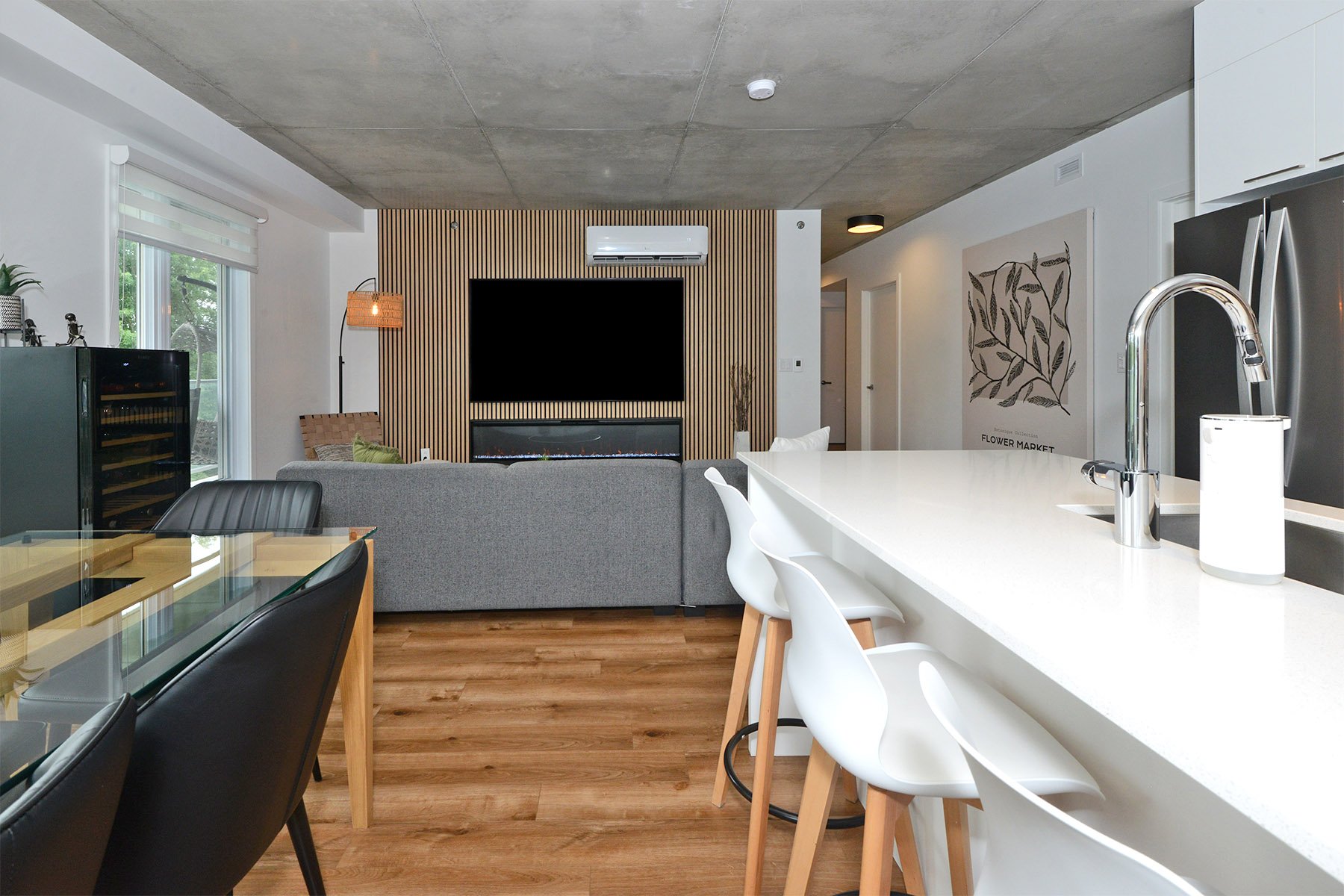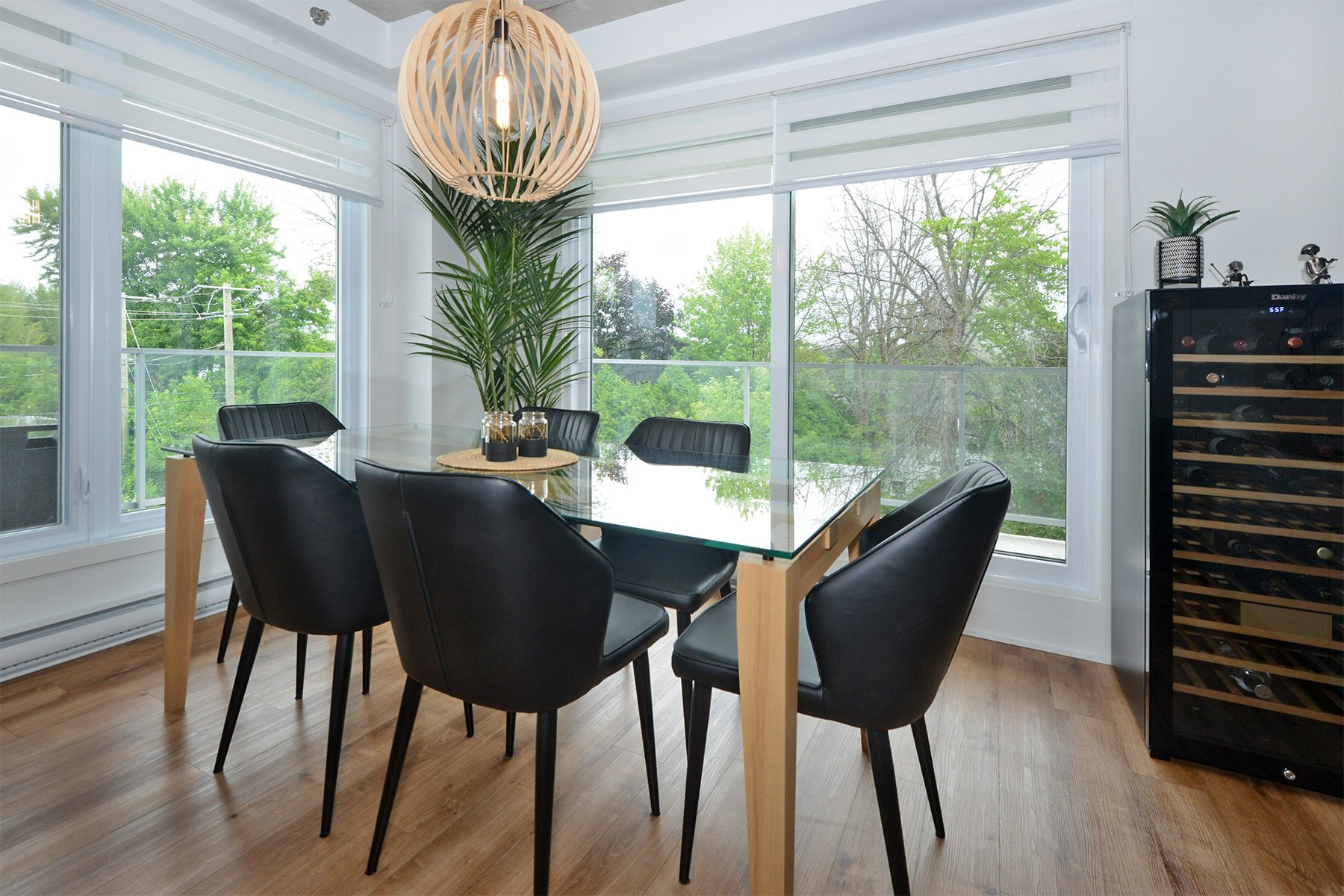 Inclusions | Luminaires, stores, bancs de comptoir (4), cuisinière, réfrigérateur, micro-ondes, lave-vaisselle, échangeur d'air, hotte cuisinière, support T.V. (3) et foyer électrique Napoléon. |