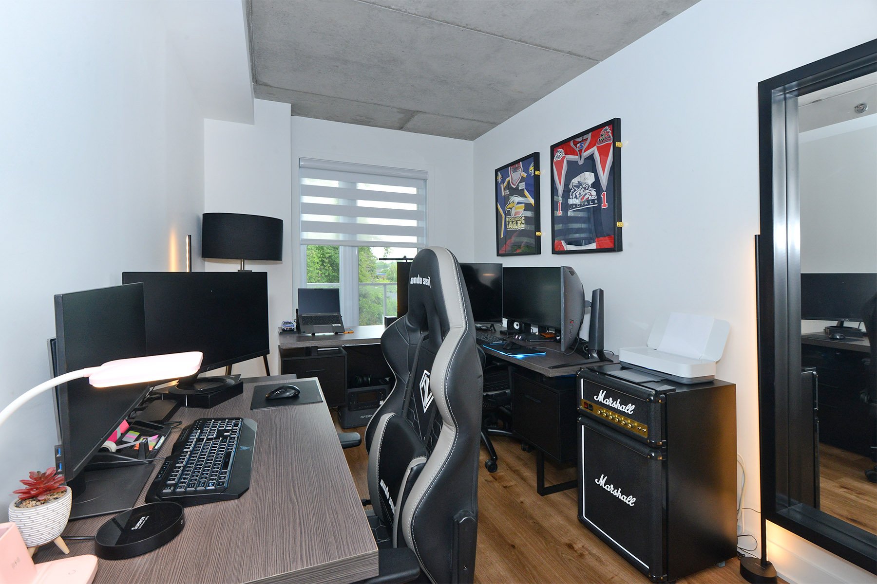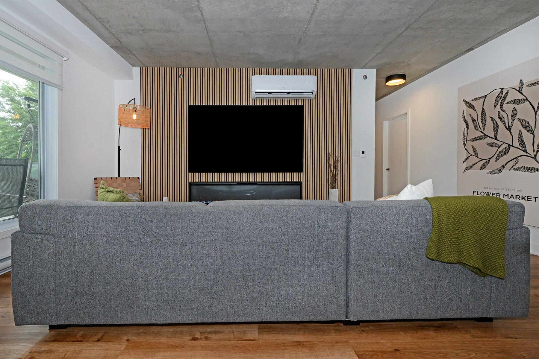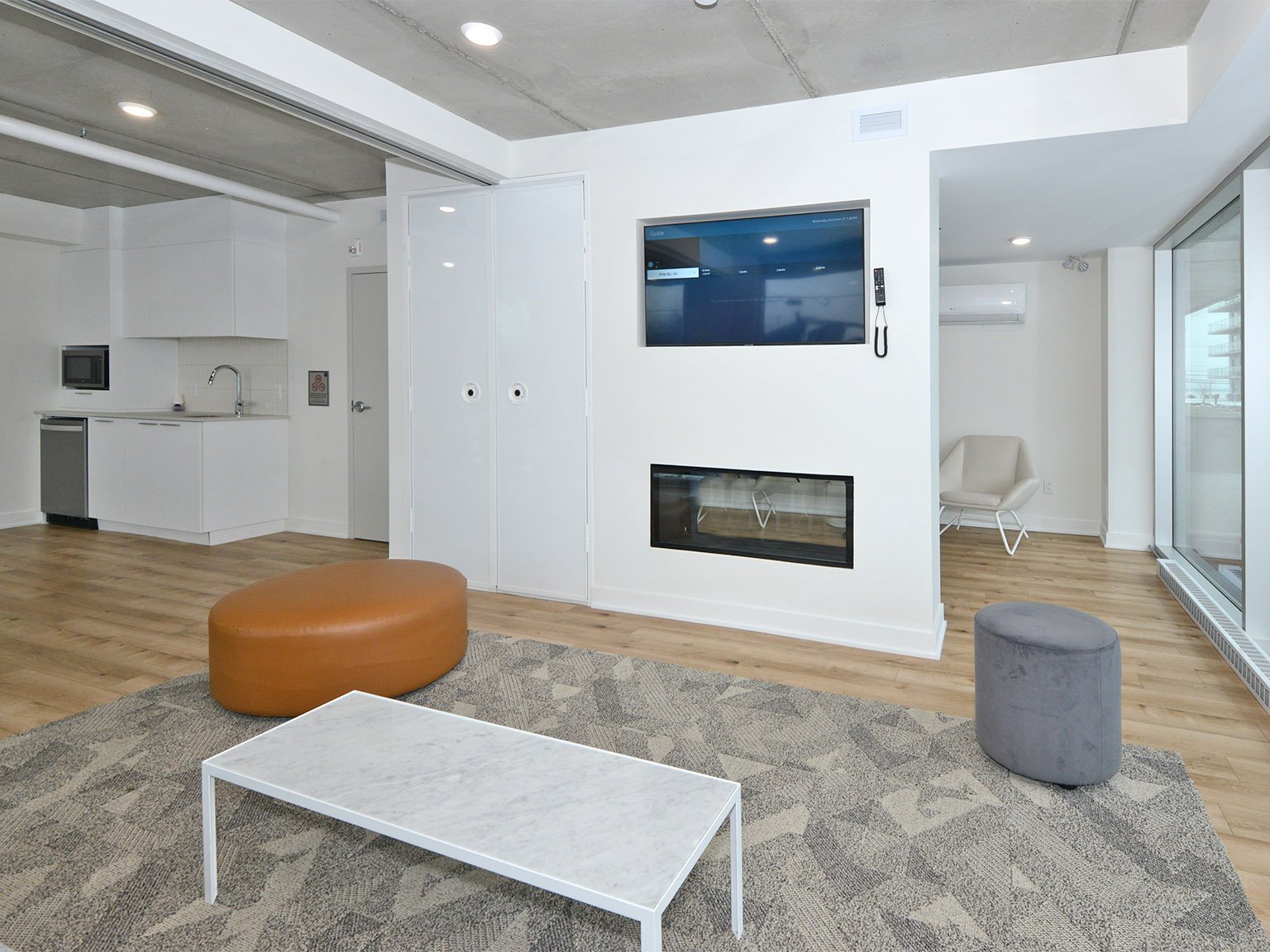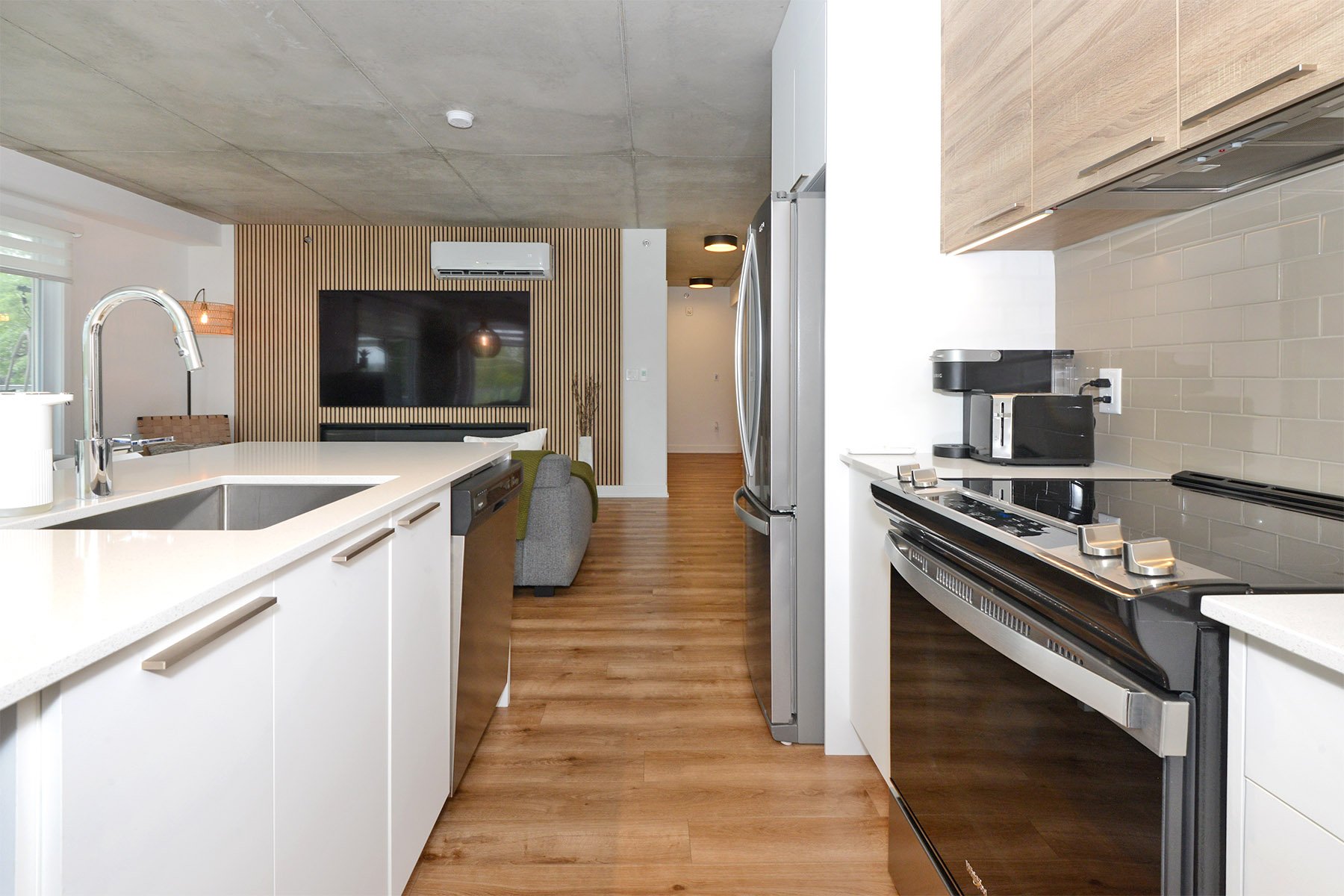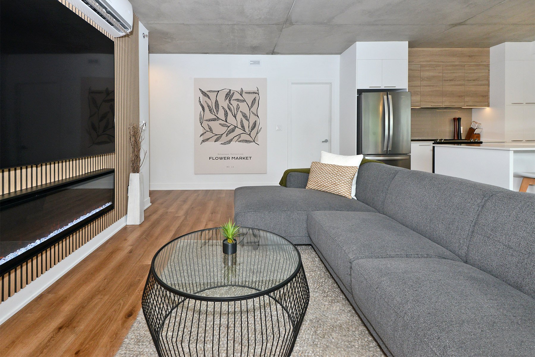 Inclusions | Luminaires, stores, bancs de comptoir (4), cuisinière, réfrigérateur, micro-ondes, lave-vaisselle, échangeur d'air, hotte cuisinière, support T.V. (3) et foyer électrique Napoléon. |